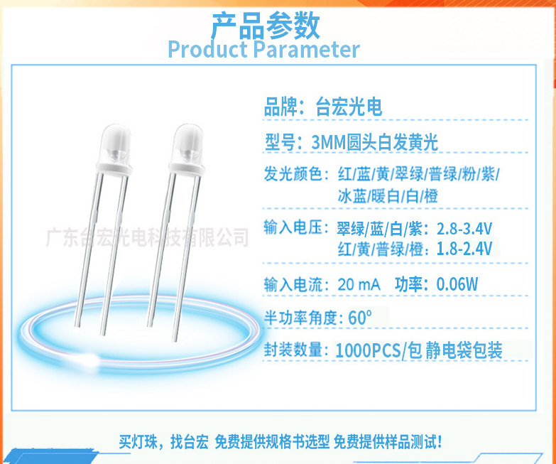 3mm白发黄led灯珠,led灯珠白发黄F3MM,直插led灯珠白发黄3mm。产品参数: