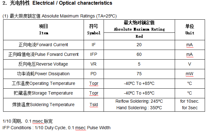 正向电压VF IF=20mA V 1.8 2.2 2.4