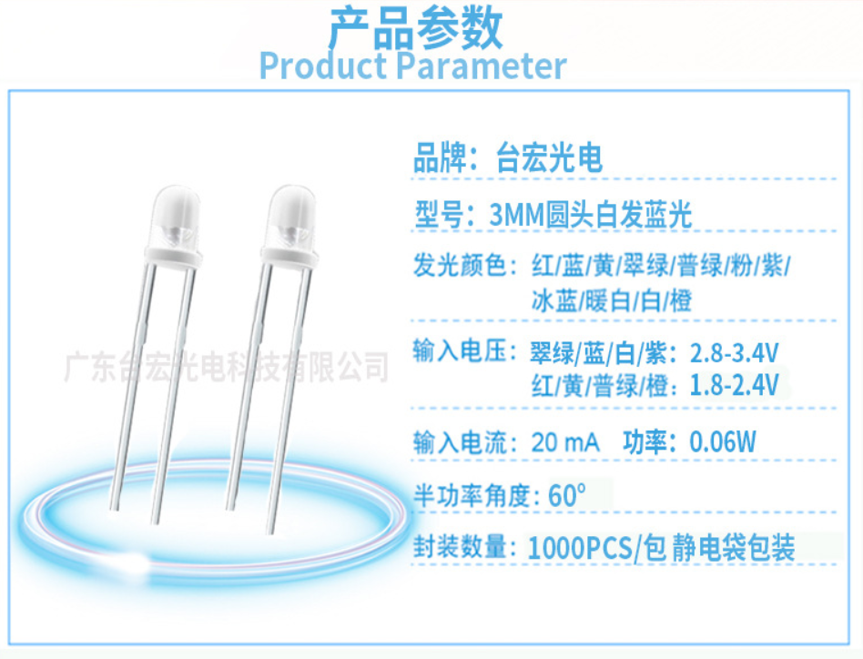 - 应用:台宏3mm发光二极管因其体积小巧,常用于手机、电脑、数码相机等产品的指示灯和背光。