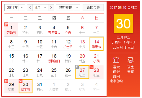 2017年5月28日—5月30为端午节国家法定假日,放假三天,安排如下: