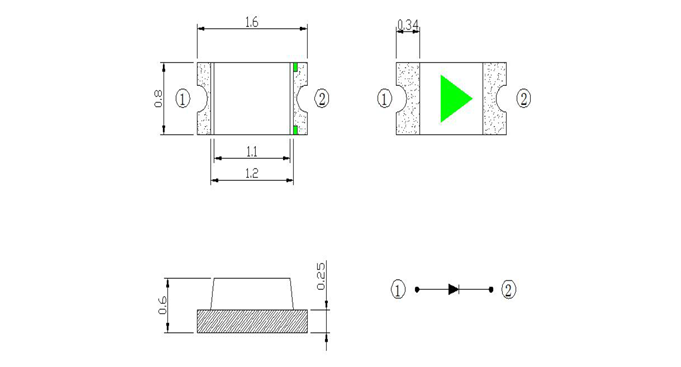 四、0603灯珠灯珠尺寸:(凸头单色系列尺寸图)