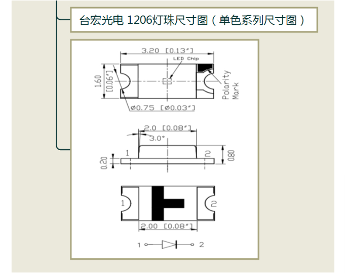 五、1206灯珠凸头单色尺寸图:(台宏光电1206灯珠(凸头单色系列)尺寸图)