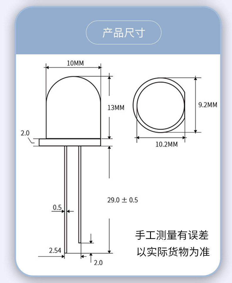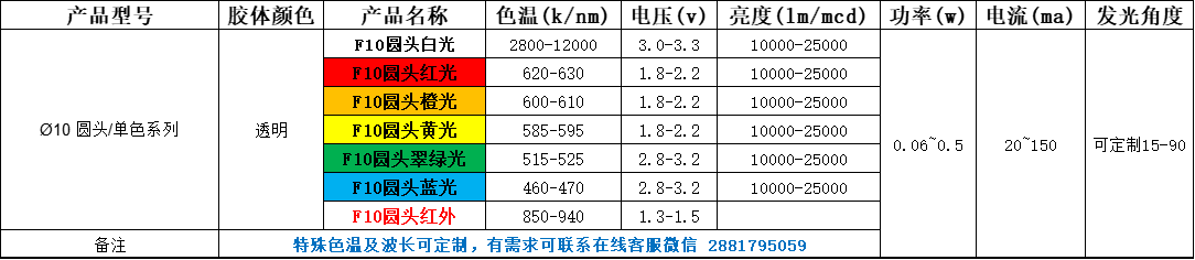 Ø10 圆头/单色系列 | 透明 | F10圆头白光 | 2800-12000 | 3.0-3.3 | 10000-25000 | 0.06~0.5 | 20~150 | 可定制15-90 | 如下尺寸图 | 500 |