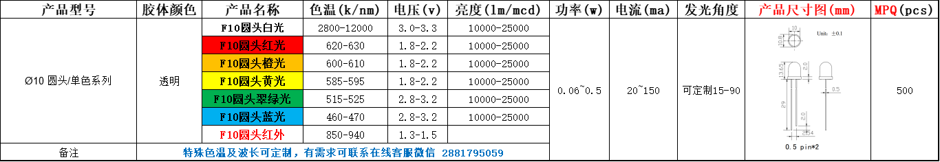 10mm灯珠是指直径为10mm的LED灯珠,具有较大的光发射面积和120度左右的发光角度,可提供更广泛均匀的光线分布,适用于大部分灯具设计。它发光效率较高,品牌灯珠寿命一般可达到50000小时以上,能节约能源并降低维护成本。常用于DIY改装车灯、广告灯箱、交通信号灯、大型显示屏等场景。