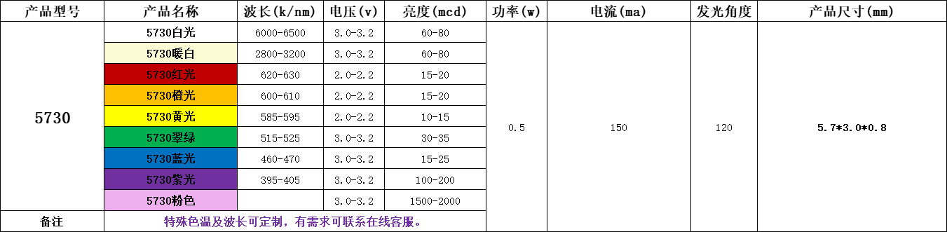 参数/特性 2835灯珠 5730灯珠