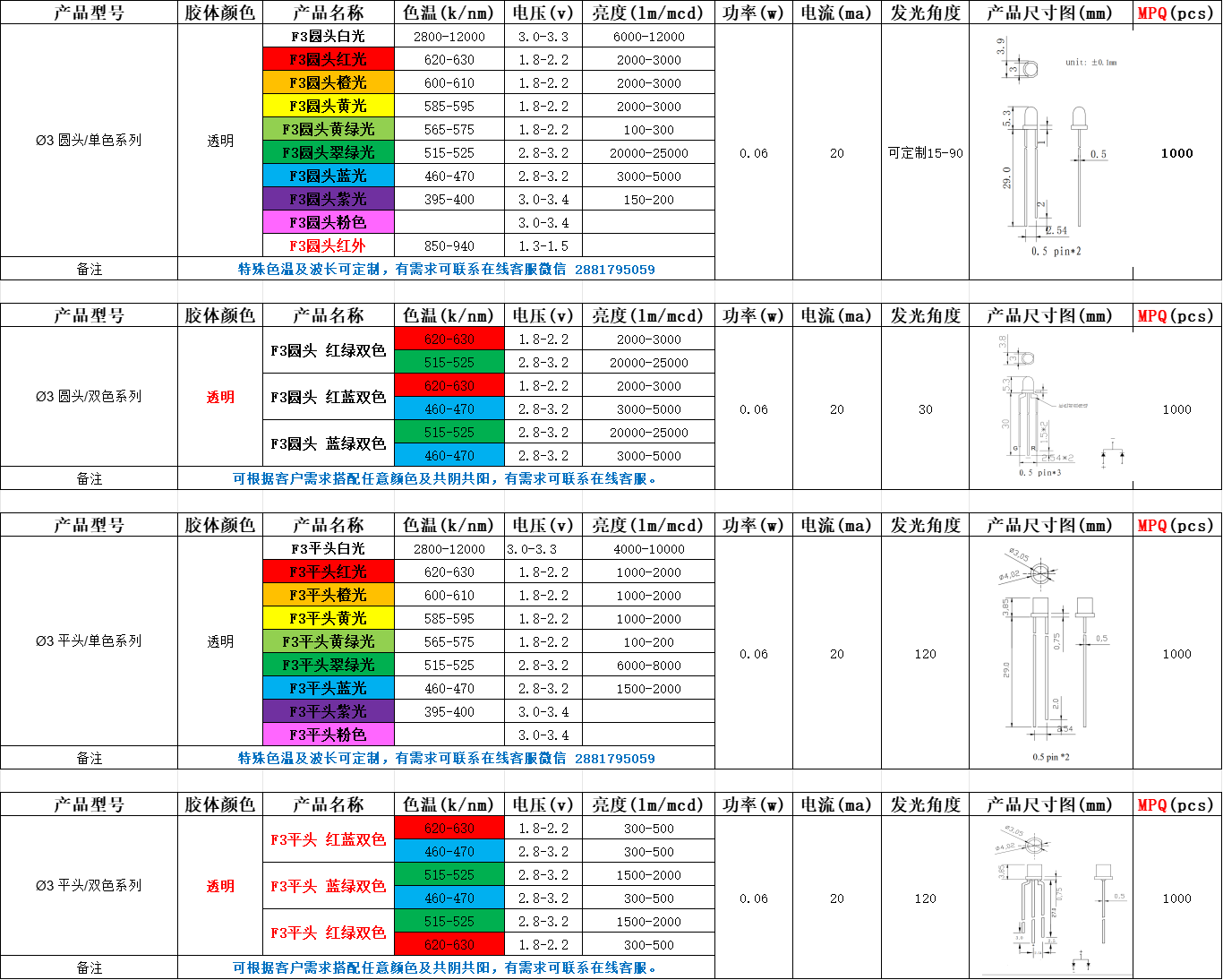 根据灯珠厂家台宏光电的规格书和样品参数资料,3mm发光二极管的电流和电压参数如下: