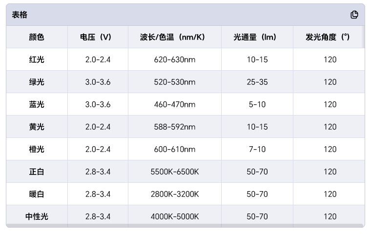 电压:白光系列电压一般是2.8V-3.4V,红光、普绿光、橙光和黄光等彩光电压通常在1.8V-2.4V之间,蓝光、翠绿光、紫光等彩光电压为2.8V-3.4V。