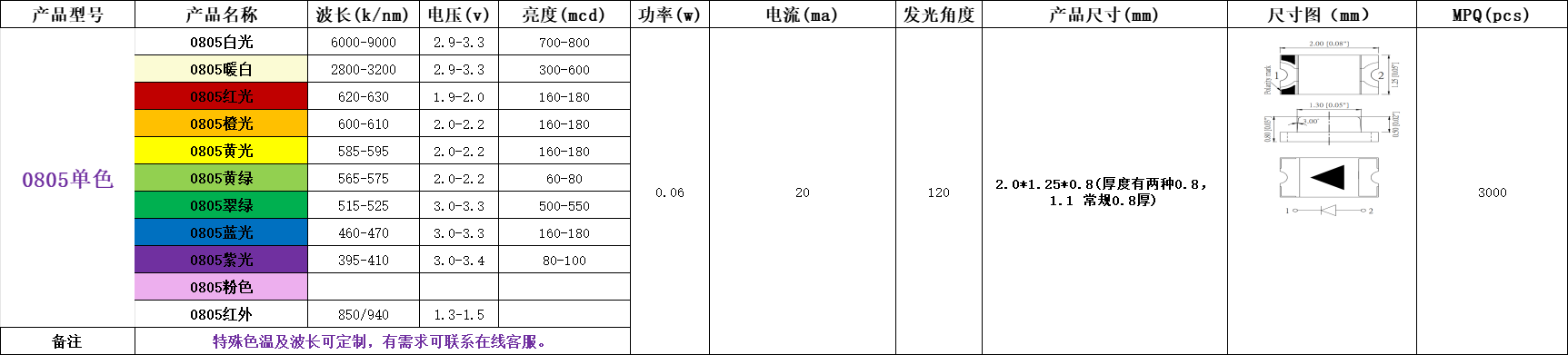 | 白光 | 蓝光芯片+荧光粉 | 2.8-3.6V | 电压接近蓝光,暖白略低于冷白 |