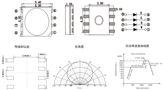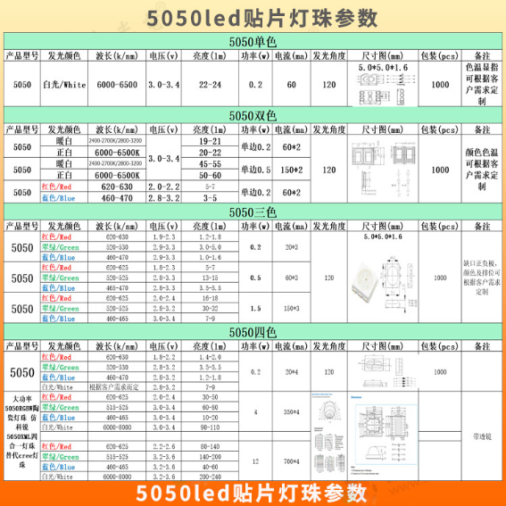 5050双色灯珠,5050三色、幻彩灯珠,5050四色灯珠,请看下表的参数: