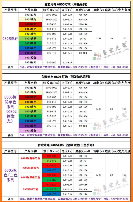 0805灯珠功率是0.06W,电流20mA, 波长,电压,亮度参考下表: