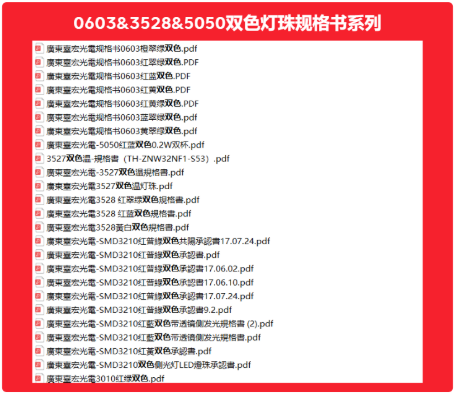 双色灯珠规格书包括3mm双色led灯珠,5mm双色led灯珠,0603双色灯珠,0805双色灯珠,1206双色led灯珠,5050双色灯珠系列等,共计几十种规格书。