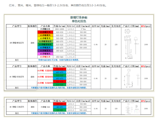 按功率分,一般有5mm草帽0.06瓦,0.1瓦和0.2瓦。8mm,10mm同样也是0.06瓦单颗的功率多。