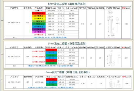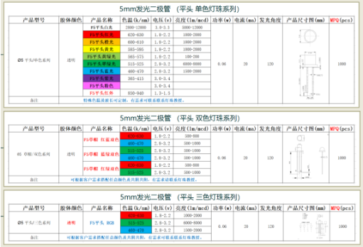 led灯珠规格型号一览表,led灯珠5mm直插发光二极管型号一览表