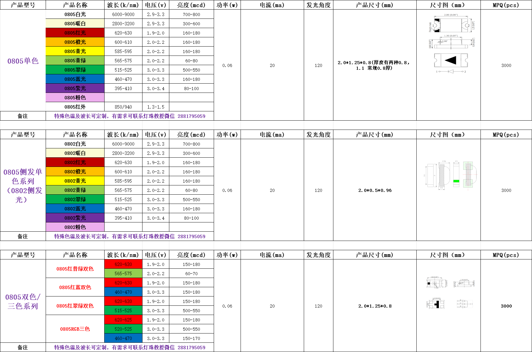 更多0805灯珠电流,电压,波长,亮度,功率,发光角度等参数如下表: