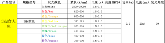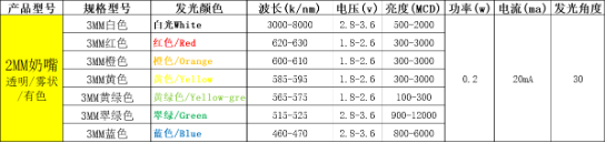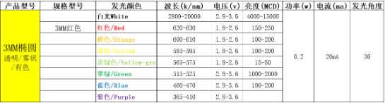 3mm直插椭圆透明雾状led灯珠型号一览表