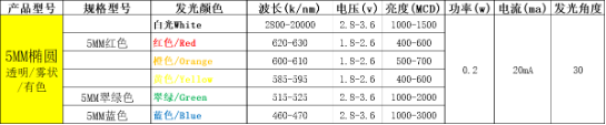 5mm直插椭圆透明雾状led灯珠型号一览表