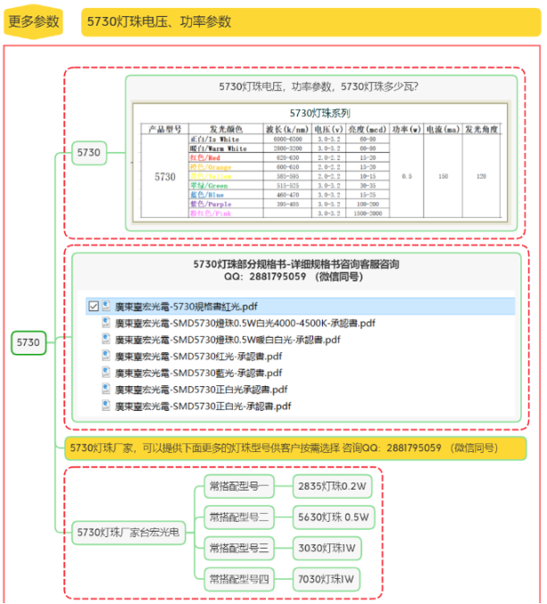 5、5730灯珠电压,电流,发光角度,波长,亮度,功率如下图。