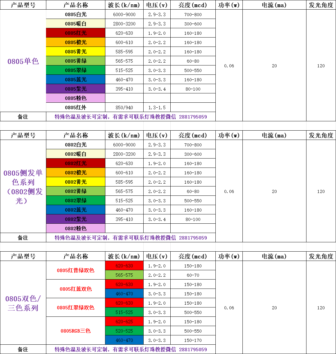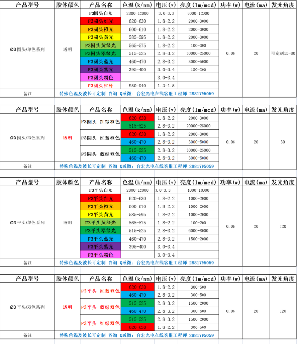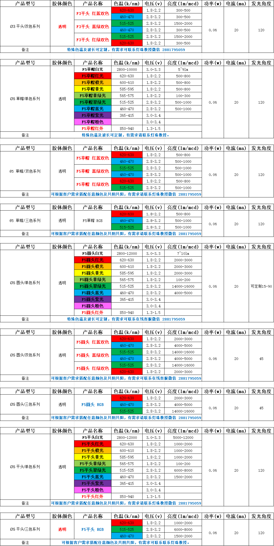 比如,2mm、3mm、4mm、5mm、8mm,10mm led灯珠单色,双色和3色灯珠规格型号对照表。