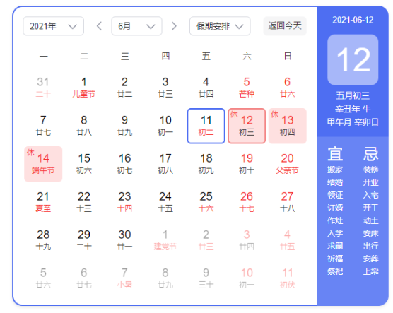端午節:6月12日至6月14日放假,共3天。 6月15日(星期二)上班。