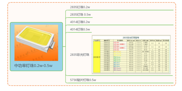 中功率灯珠一般是每颗0.2-0.5w, 比较常见的型号有2835灯珠,4014灯珠,5730灯珠等。这些灯珠的应用比较广,有单色的,也有彩色的,像2835彩光灯珠,5730红光,5730绿光,5730蓝光灯珠,一般都是0.5W的。