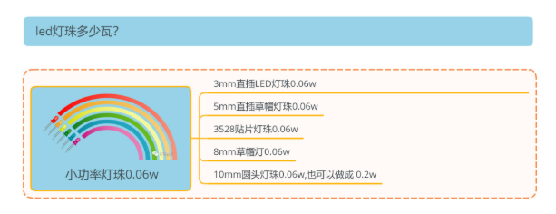 一般来说,小功率led灯珠,一颗是0.06w。主要型号有3mmled灯珠,5mmled灯珠,8mmled灯珠,10mmled灯珠这种直插类型的小灯珠,当然,有些插件灯珠型号也可以做成大支架0.2w的。