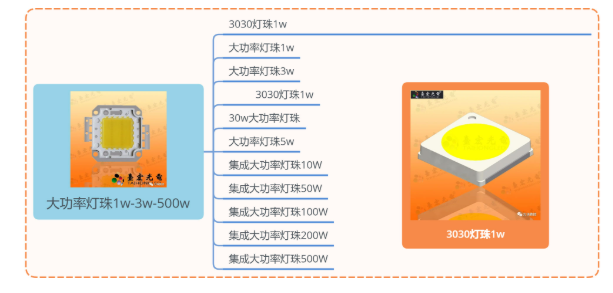 集成大功率灯珠一般每颗是10W以上,有20W,30w,50w,80w,100w,200w,500w等集成大功率灯珠,一般这些灯珠用在比较大的照明灯具上,比如隧道灯,工矿灯上。