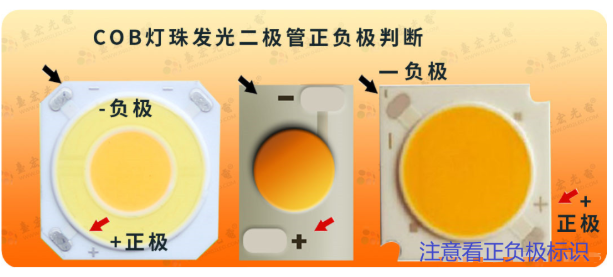 cob led灯珠正负极和集成大功率灯珠一样,正负极一般都标识在发光二极管的基板上,如下图。