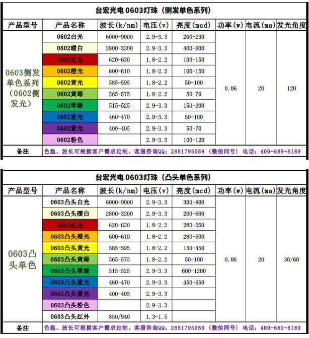 如台宏光电的0603灯珠系列电压:(白光,彩光,单色,双色,三色,侧发系列)
