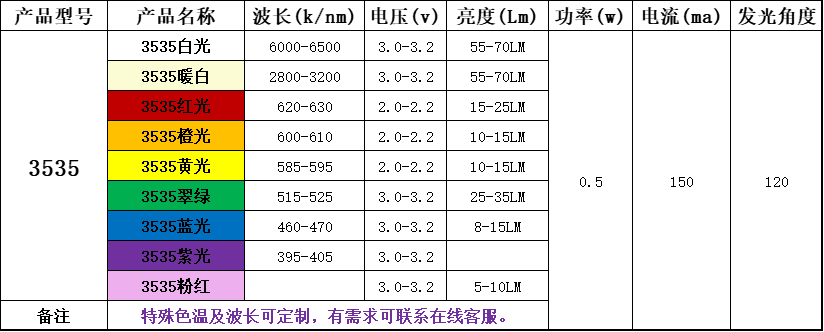 - 贴片式:如0805、3528、5050、3030、3535大功率陶瓷封装,体积小、适合自动化生产,多用于小型化设备(如智能摄像头、穿戴设备)。
