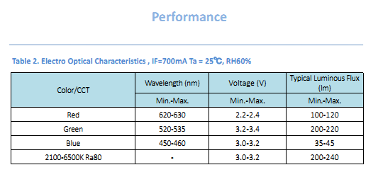 4、台宏5050 RGBW 灯珠小功率采用常规通用型支架,大功率支架材料台宏选用的是氮化铝陶瓷基板(导热系数 380W/m・K),表面镀银处理抗硫化。