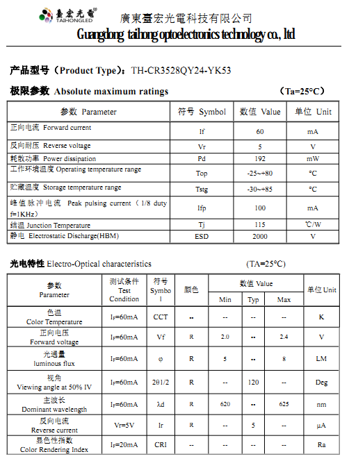 规格型号:TH-CR3528QY24-YK-53(4脚共阴)