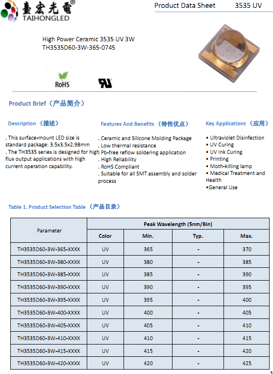 其中,365灯珠, 365uv灯珠,紫光365nm灯珠,台宏365紫外灯珠,365验钞灯珠参数。