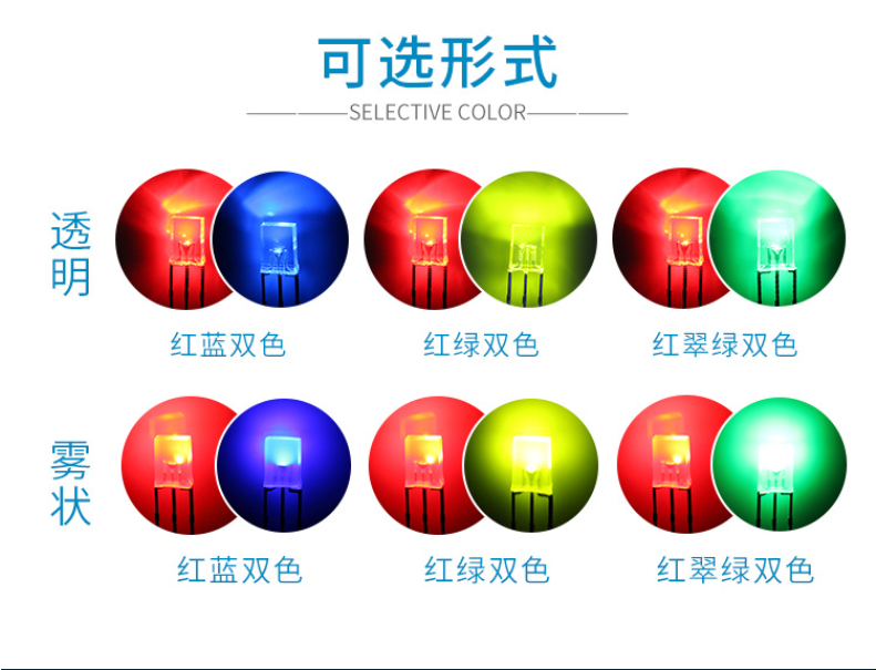 2、方形发光二极管的规格型号,颜色。如灯珠厂家台宏2×3×4mm、2×5×7mm、2×5×5mm等,颜色包括红、绿、蓝、黄、白、紫等,部分产品支持双色(如红绿、红蓝)或RGB全彩。部分产品支持定制,如共阴、共阳、无极等连接方式。