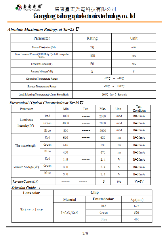 3、RGB灯珠型号 F5mm 电气参数,正向电压:红(R):1.8V-2.2V ,绿(G)/蓝(B):2.8V-3.4V,作电流(IF):20毫安,反向电压:≤5V(避免接反和避免长时间5V使用)。功耗:0.06W 。