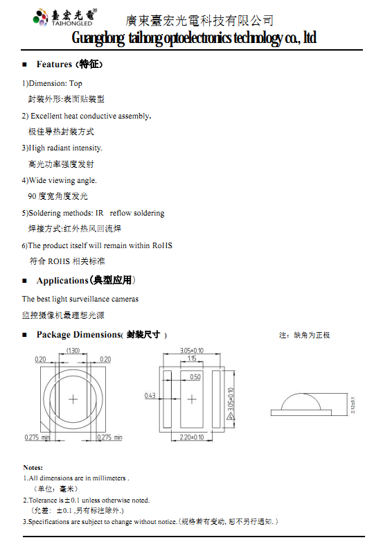 贴片红外发光二极管3535 0.5瓦 850nm 90度红外灯珠产品特点: