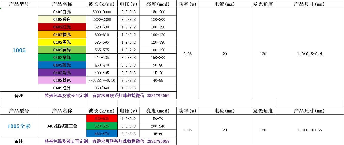 1005灯珠,其实就是我们常说的0402灯珠,规格是1.0X1.0X0.4mm(厚度)
