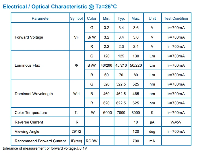 波长:R: 620-630NM / G: 520-530NM / B:455-460NM / W: 6000-8000K