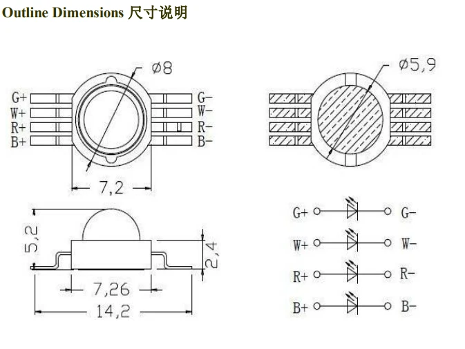 4w仿流明led灯珠大功率8脚 四合一 RGBW led灯珠规格书,