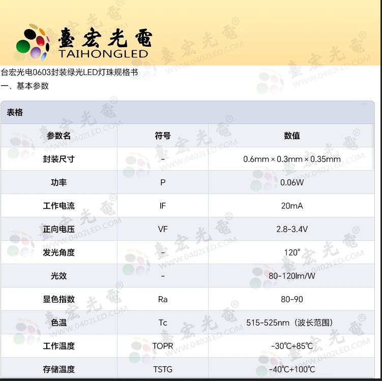以下是台宏光电0603封装、波长在515-525nm范围内的绿光LED灯珠的技术参数和相关信息: